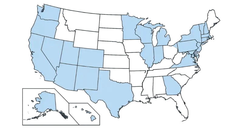 Covered States include: Alaska, Arizona, California, Colorado, Connecticut, Hawaii, Indiana, Illinois, Massachusetts, Michigan, New Hampshire, New Jersey, New York, Oklahoma, Oregon, Pennsylvania, Texas, Utah, Vermont, Virginia, Washington, West Virginia, Wisconson, Wyoming